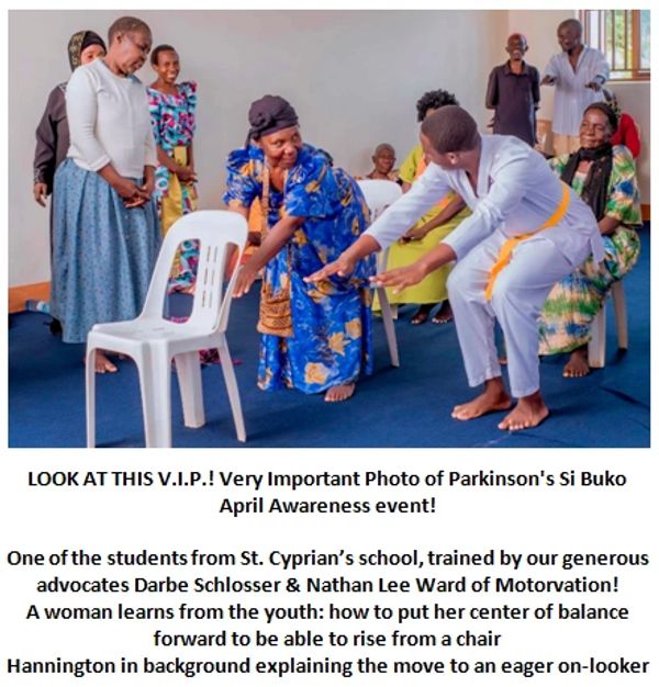 St. Cyprian kids and attendees. Many demonstrations and the kids showing moves for those who have PD or other movement issues. Why, you ask, are there so many women? Where are the men? In Uganda, the men are the usual daily breadwinners. They cannot (will not) show their Parkinson's symptoms in the workplace. If they do, they can be exposed as touched by BUKO (witchcraft) and no one will want to work with them. After all, the majority of rural/small town people still understand PD to be contagious....but Si Buko is working on that!
